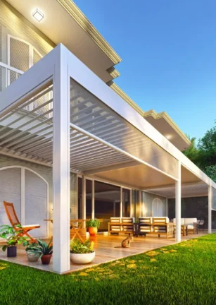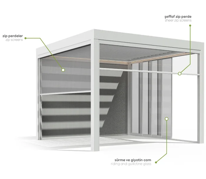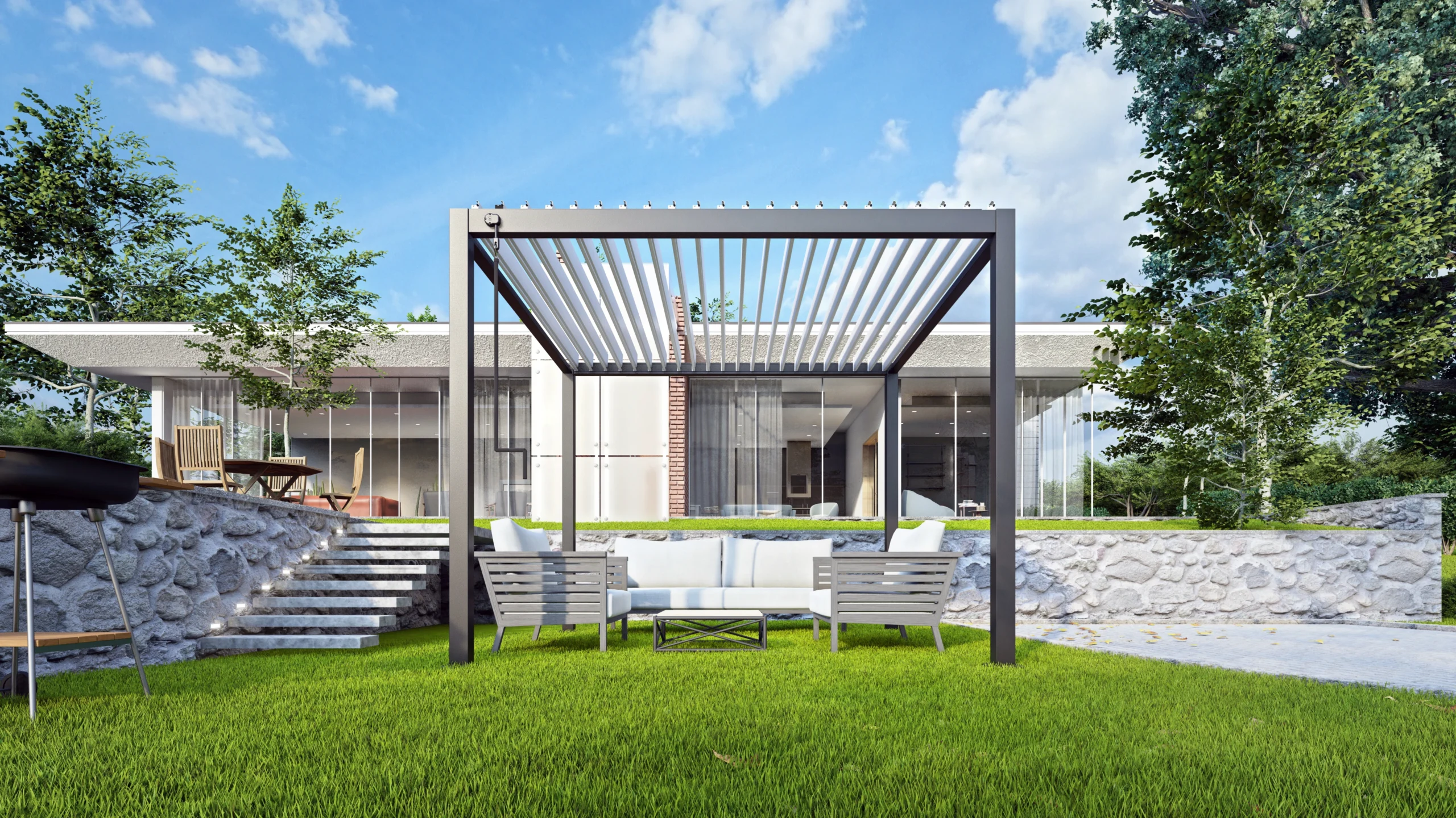 Dilediğiniz ebatta aluminyum malzemeden üretilen, motorlu ve manuel seçenekleri bulunan panel açısı ayarlanabilen bioklimatik pergola