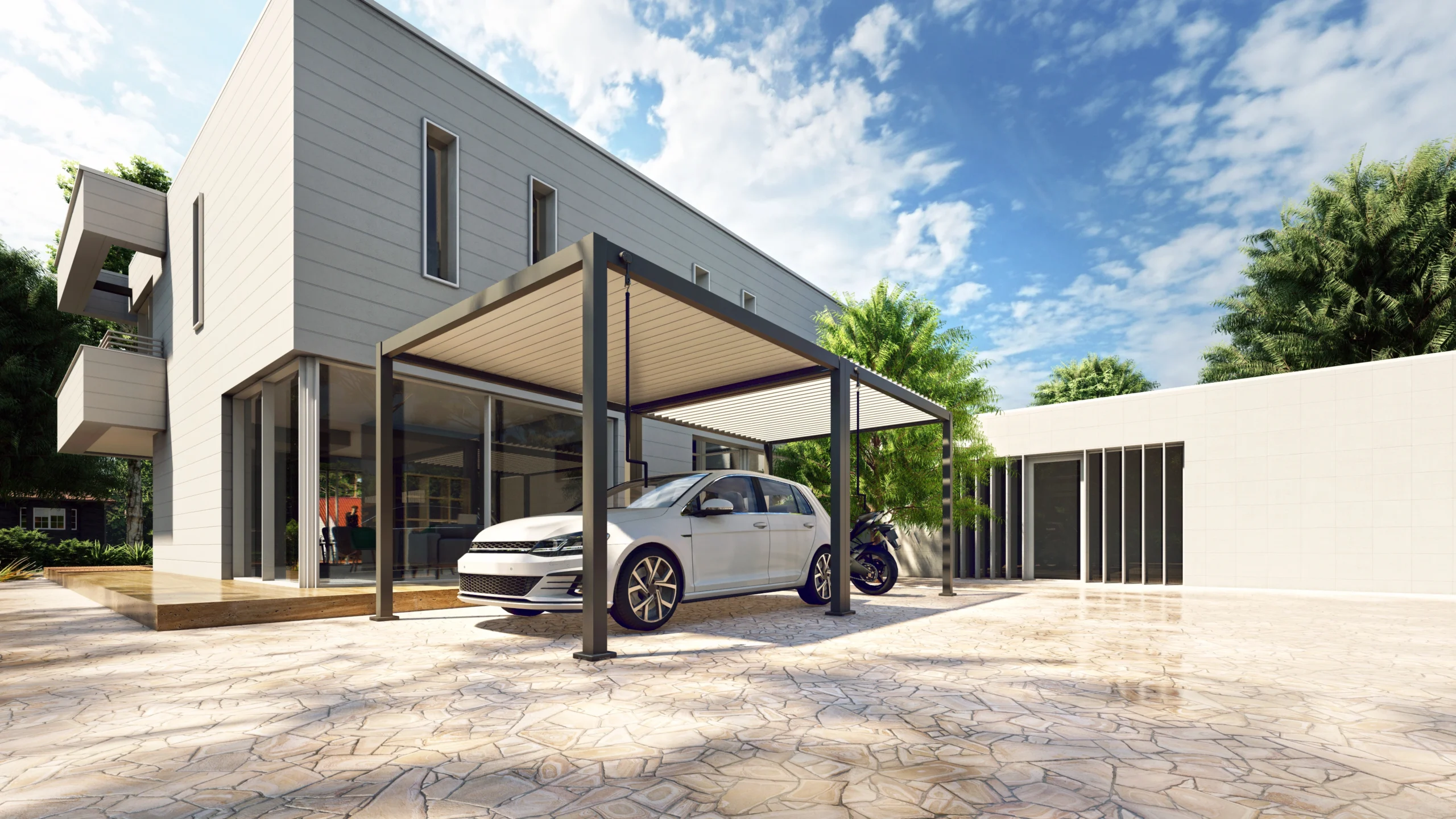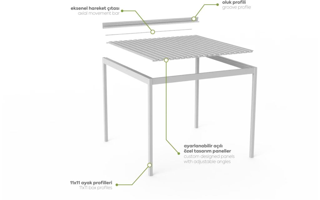 Dilediğiniz ebatta aluminyum malzemeden üretilen, makaslı sistem, panel açısı ve açıklığı ayarlanabilen motor mekanizmalı bioklimatik pergola